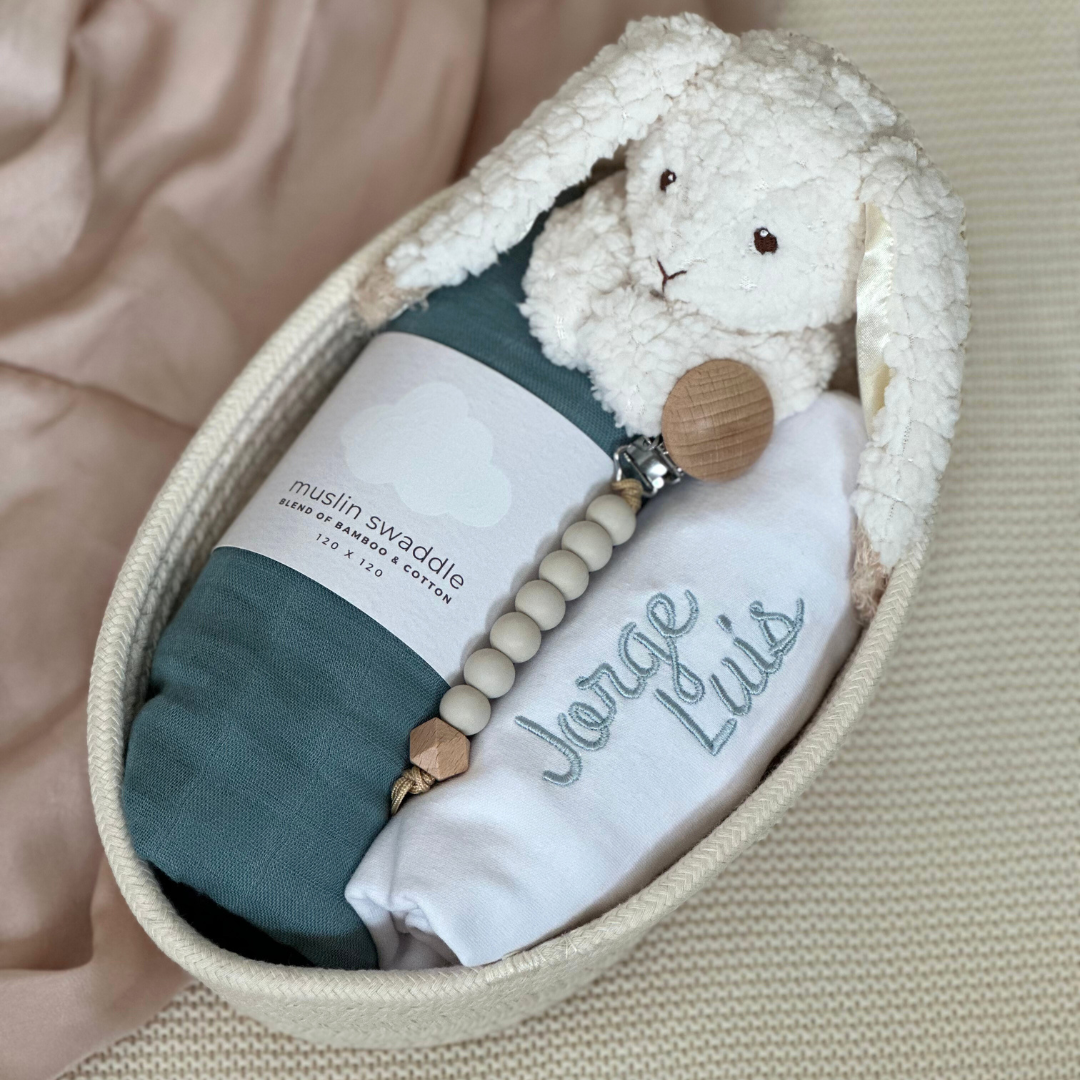 Sorprende a los nuevos papás con esta hermosa canasta de regalo para bebé, cuidadosamente diseñada para brindar comodidad, suavidad y un toque especial con bordado personalizado.